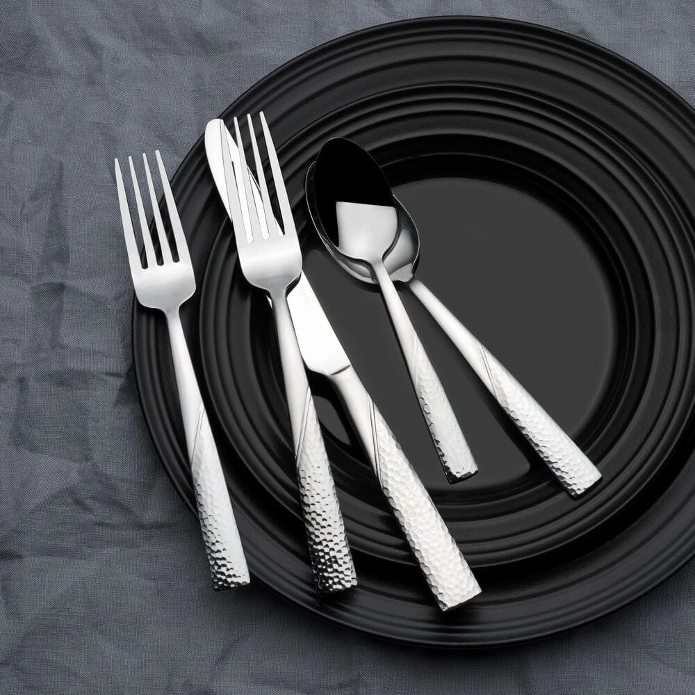 This Gourmet Basics Barletta Flatware Set features a two tone hammered design and frost finish that will make an eye-catching statement.