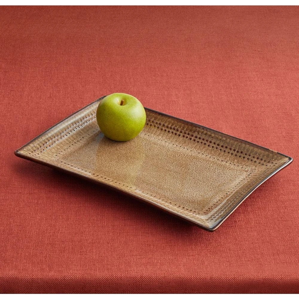 Crafted of Stoneware, featuring a reactive glaze. Due to the nature and hand-crafted qualities of reactive glaze, no two pieces are exactly alike and will exhibit unique variations in color and pattern. Product may slightly differ from image shown. Platters such as this have so many uses. You can use it as a deli tray, offering cheese, olives, strips of roasted pepper and pickled eggplant for a cold antipasto appetizer. Yet it also make a charming and inventive presentation when offering guests “welcome” snacks such as cookies, pastries or even finger sandwiches. Microwave and dishwasher safe. Rectangular Platter measures 14 inch long x 9 inch wide.