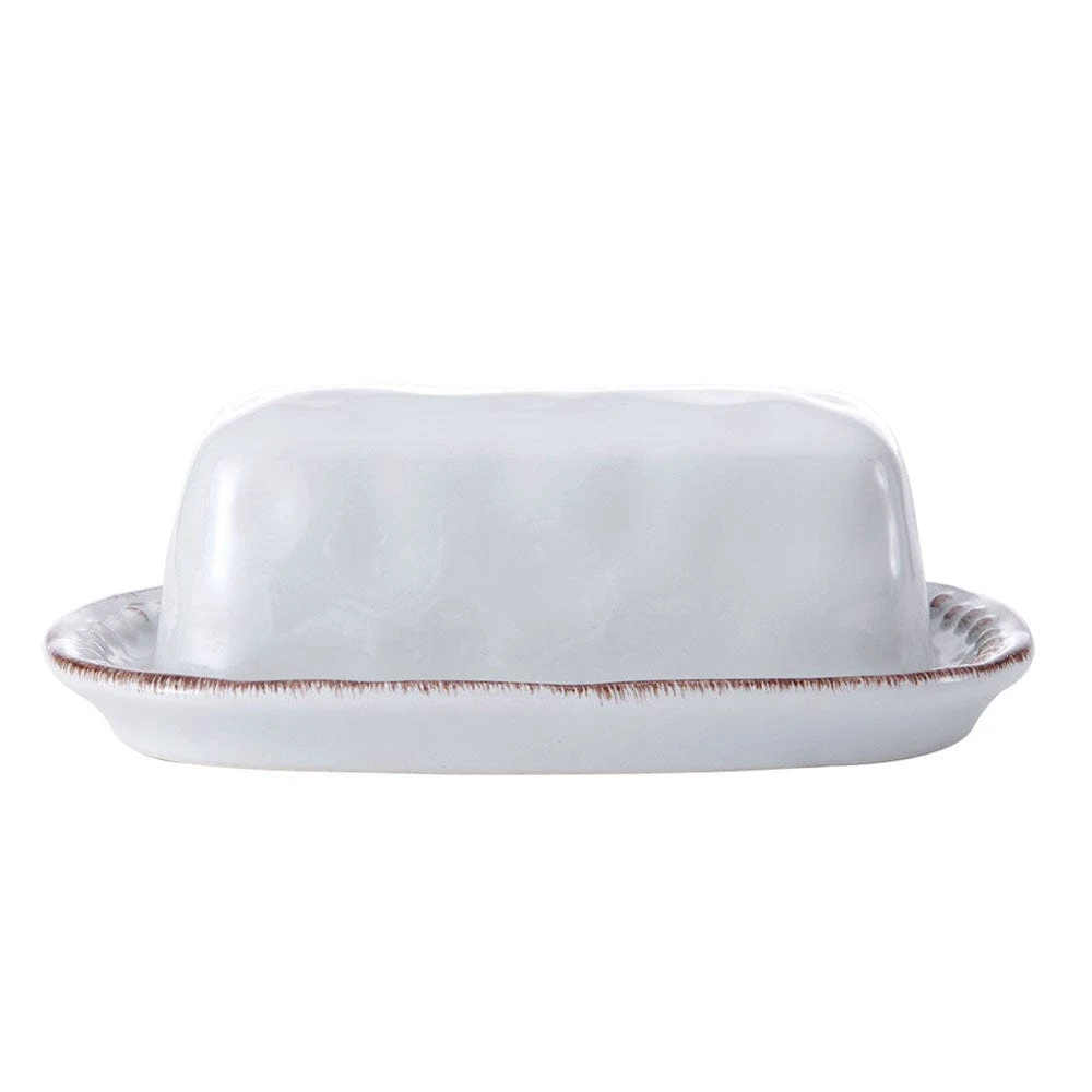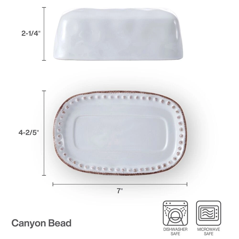 This Canyon Bead Covered Butter Dish features a unique, warped shape, with large yet subtle dents on the surface, and a beaded band encircling the rim, adding a rustic and contemporary accent to your table.