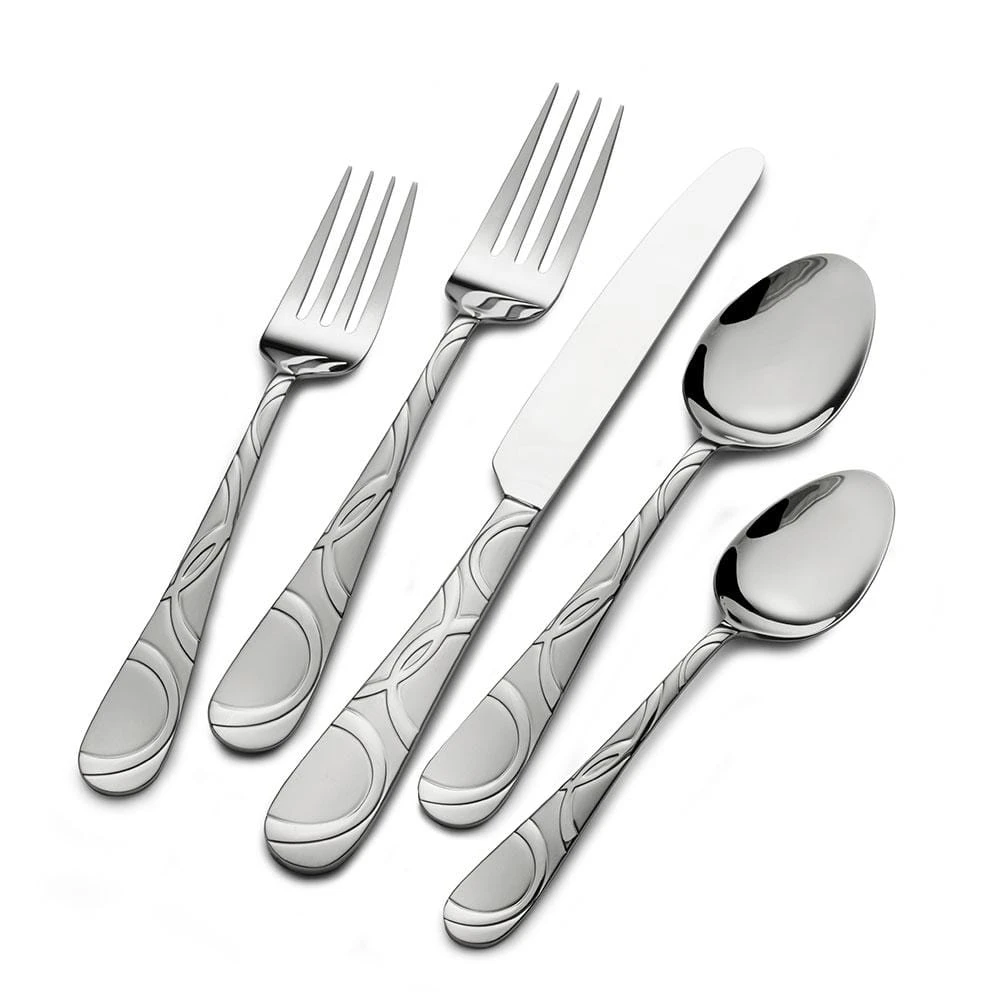Pfaltzgraff Everyday Garland Frost Flatware Set features a fun swirl pattern on the handle with a satin finish that will add a unique look to your table. Constructed of superior quality 18/0 stainless steel, this set will stand up to the rigors of everyday use. 53 Piece Set, service for eight, includes (8) each: dinner fork, salad fork, dinner knife, dinner spoon, teaspoon and steak knives, plus a 5 piece Hostess Set, which includes (1) each of: tablespoon, pierced tablespoon, cold meat fork, sugar spoon and butter knife. Dishwasher safe.