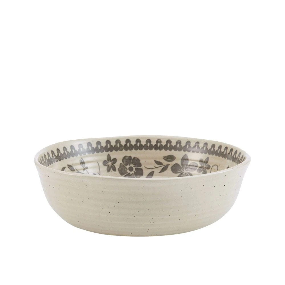 Hayden Grey dinnerware set is uniquely crafted with subtle organic shaped plates and bowls with a concentric ribbed design and a delicate floral motif. Each piece brings natural elegance to everyday dining.