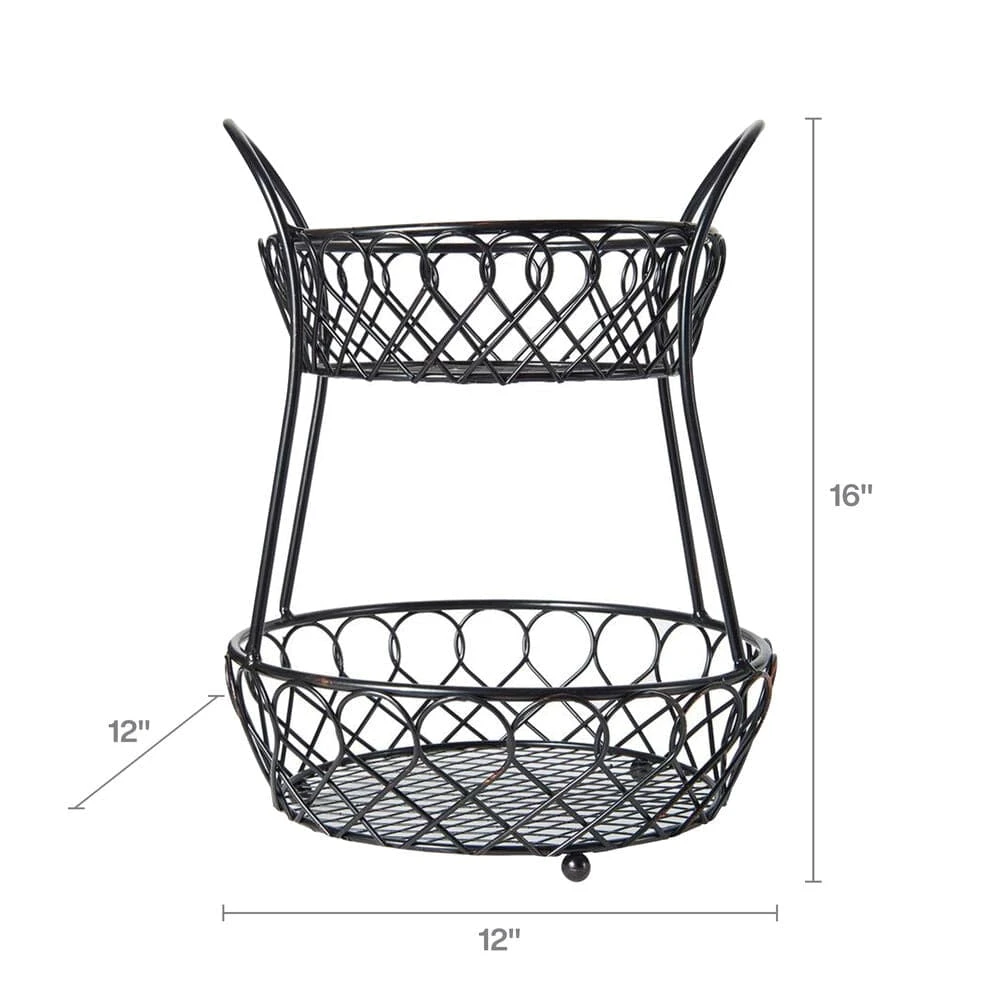 This Lattice 2 Tier Countertop Storage Basket has an antique black finish that will bring a classic touch to your décor. Handcrafted from iron for long-lasting beauty even under rigorous use, this basket features a 2-tier design to create more storage space while cutting down on counter clutter. Wipe clean with a damp cloth. Countertop basket measures 16 inch high x 12 inch diameter. This product contains Carbon Black. For more information about chemicals in this product, visit www.lifetimebrands.com/ab1200