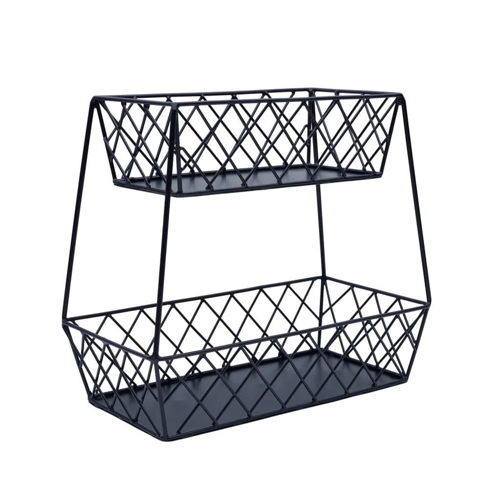 From the Gourmet Basics by Mikasa Collection, this Lattice Farm Flat Back 2 Tier Storage Basket features a 2-teir design, black finish with intricate lattice details, and allows you to store multiple items while taking up minimal counter or table space. The flat back design allows the basket to sit perfectly against the wall to save counter space.
