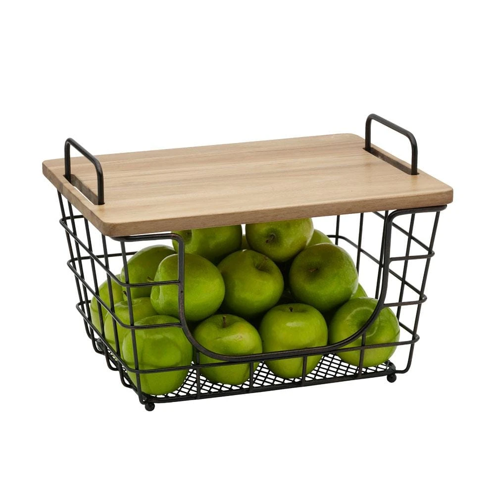 This Madam Stacking And Nesting Basket with Acacia Lid is crafted from high grade carbon structural steel with an antique black finish for long lasting beauty even under rigorous use. The stacking and nesting capabilities of the basket allows for multiple uses and easy storage. Its great for storing or displaying food or other items and features a timeless design that will complement any decor. Wipe clean with damp cloth. Basket measures 14 inch long x 11-1/4 inch wide x 10 inch high, Wood top measures 14 inch long x 11-1/2 inch wide x 1/2 inch high. This product contains Carbon Black. For more information about chemicals in this product, visit www.lifetimebrands.com/ab1200