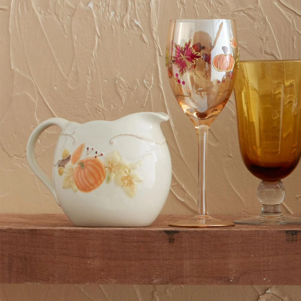This Gravy Sauce Pitcher, decorated with a harvest pumpkin theme and scalloped rim, comes in handy for family gatherings. Ideal for gravies, sauces, toppings or can be used as a creamer. Crafted of stoneware. Microwave and dishwasher safe. Gravy sauce pitcher measures 7 inch diameter x 4-3/4 inch high and holds 20 ounces.