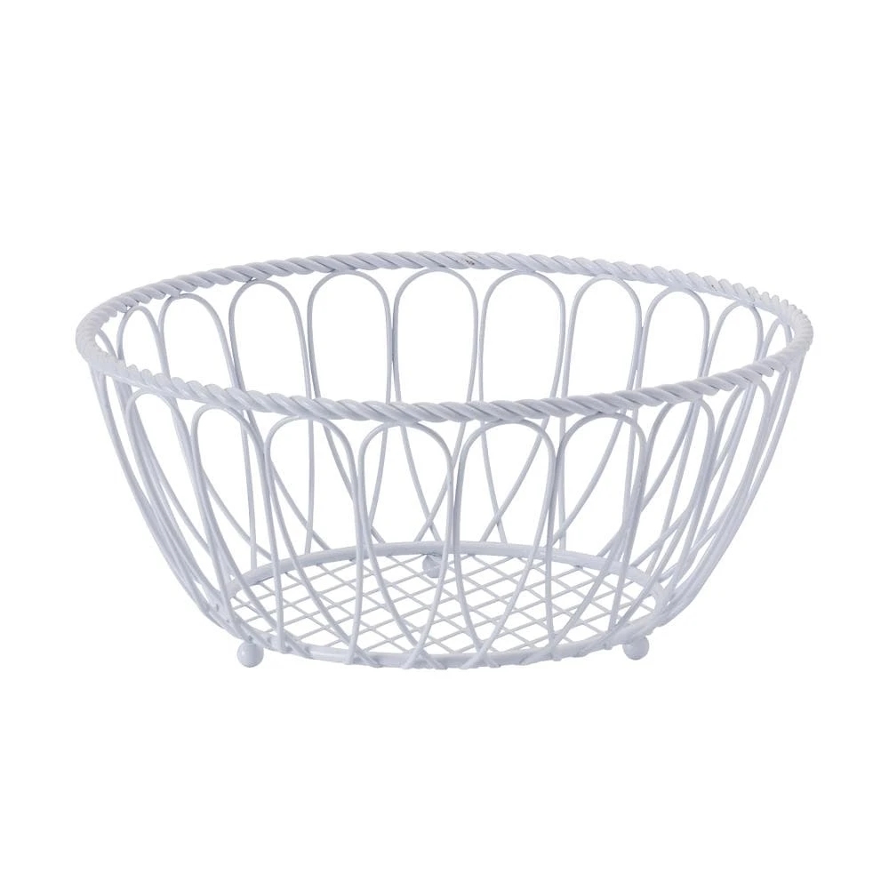 This Rope Fruit and Bread Basket is an attractive centerpiece for your kitchen table when filled with fruit. Crafted from wrought iron for long-lasting beauty even under rigorous use, the basket has a contemporary white finish and rope twist design. Wipe clean with a damp cloth. Rope basket measures 10 inch diameter x 4-1/2 inch high. This product contains Carbon Black. For more information about chemicals in this product, visit www.lifetimebrands.com/ab1200