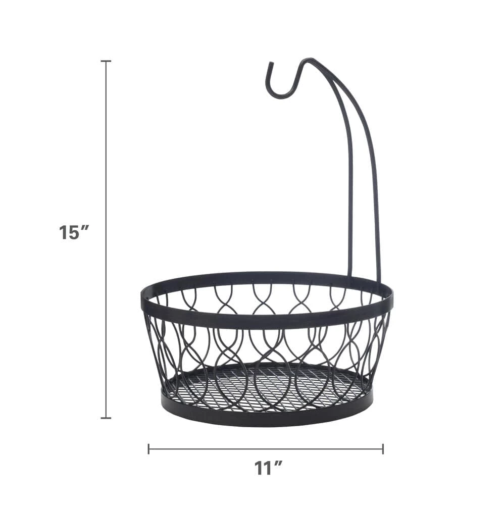 This Rustic Farmstand Fruit Storage Basket with Banana Hook is perfect for storing and displaying fresh fruit and vegetables, or other foods or items. The wire frames have an antique black brushed finish and are an open and airy design, meaning contents are visible to the eye. This craftsmanship allows for a colourful display of fresh produce to add an authentic touch to any kitchen or food pl ace. Crafted from high grade carbon structural steel for long lasting use. Wipe clean with a soft, damp cloth. Measures 11 x 14 inches. This product contains Carbon Black, for more information about chemicals in this product, visit www.lifetimebrands.com/ab1200