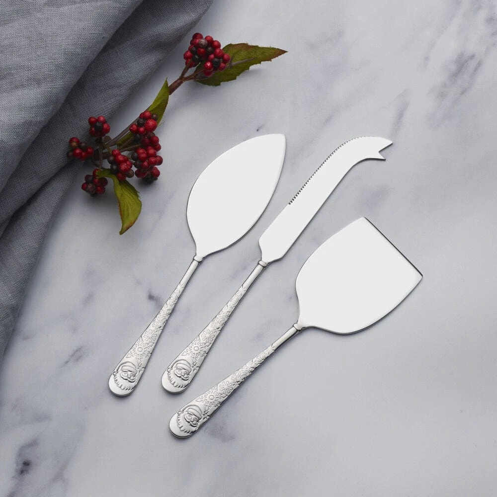 This Towle Everyday Santa 3 Piece Cheese Set is delicately curved with traditional teardrop handle silhouettes adorned with snowflakes and a jolly Santa face.