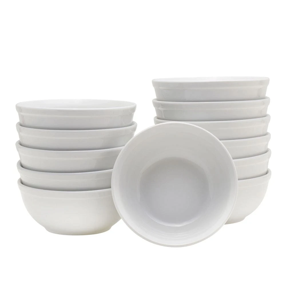 This Towle Set of 12 Cereal Bowls feature a classic white shape, perfect for large gatherings or everyday use, and will add a bright and basic accent to your table.