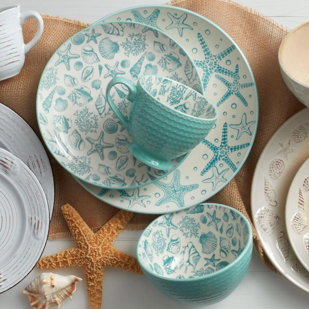 A whimsical starfish and seashell pattern will make a splash for your summer table. Crafted of stoneware. Microwave and dishwasher safe. Set of 4 mugs, each holds 12 ounces.