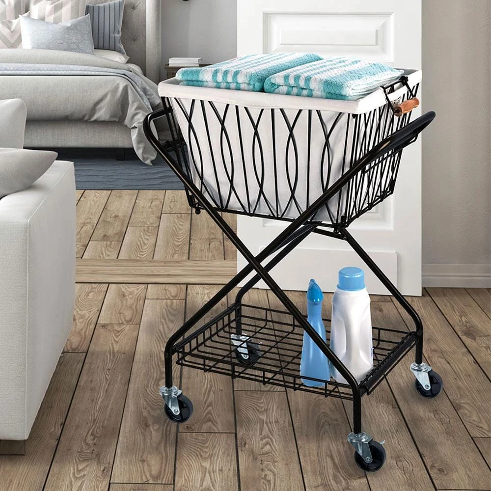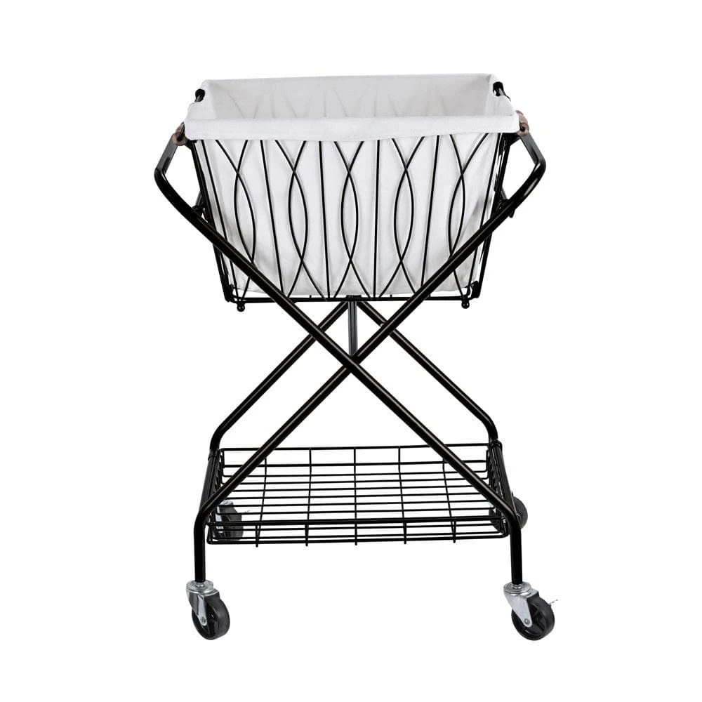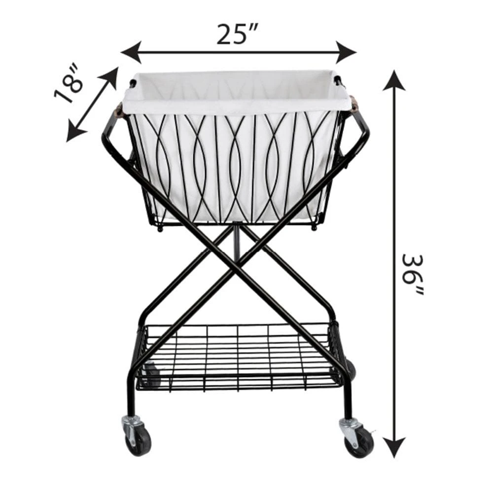 This Artesa Verona Laundry Cart with Removable Basket and canvas bag will help you sort and organize your laundry. Features wheels that allow for convenient movement and a large basket that provides extra storage. A bottom shelf provides storage for your laundry detergent, fabric softener and more! The design is functional for everyday use, and conveniently folds for easy storage. Constructed of carbon structural steel and canvas, with a antique black, modern design. Laundry cart measures 27 inch long x 18 inch wide x 35 inch high. Weight 23 pounds.